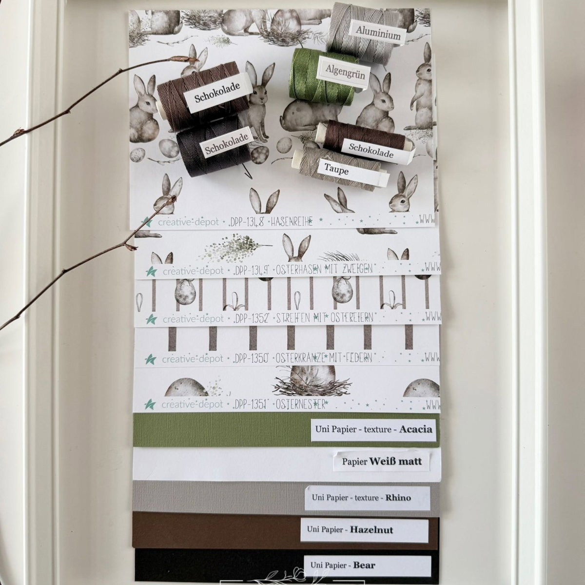 Información sobre el producto "Designpapier - Osterkränze mit Federn - Doppelseitig bedruckt"