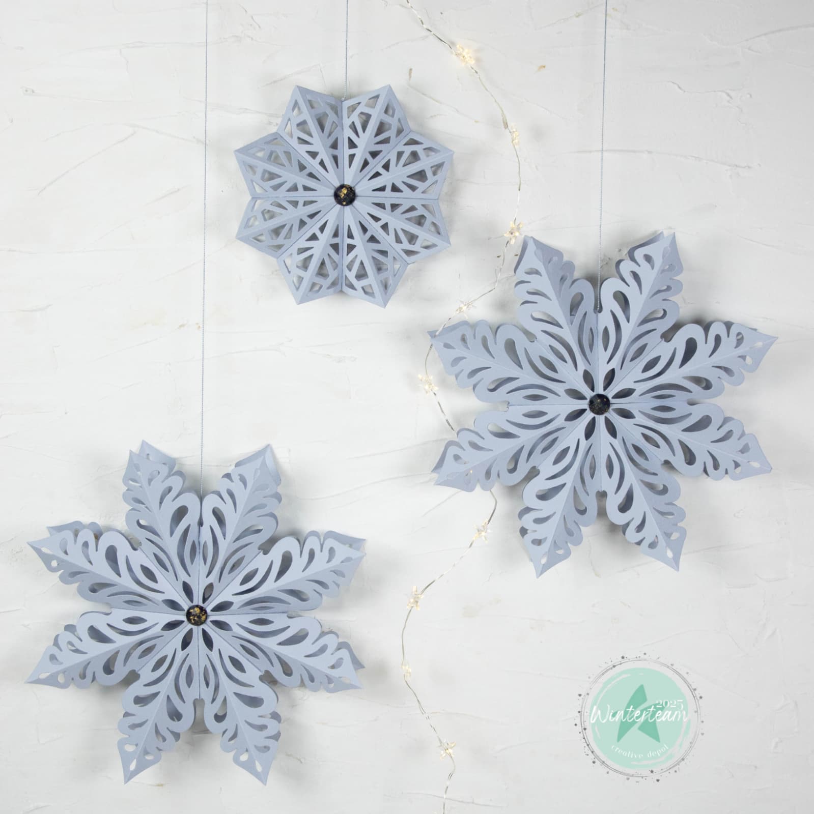 Combina varios copos de nieve de distintos tamaños y colores para crear una impresionante cortina de copos de nieve o una obra de arte invernal móvil