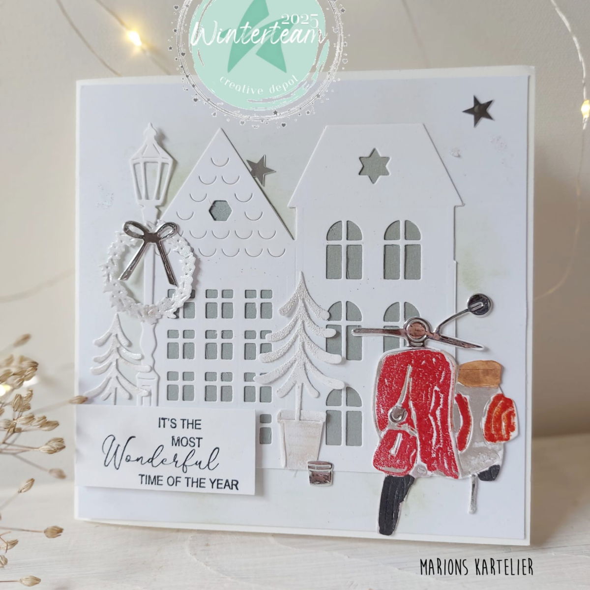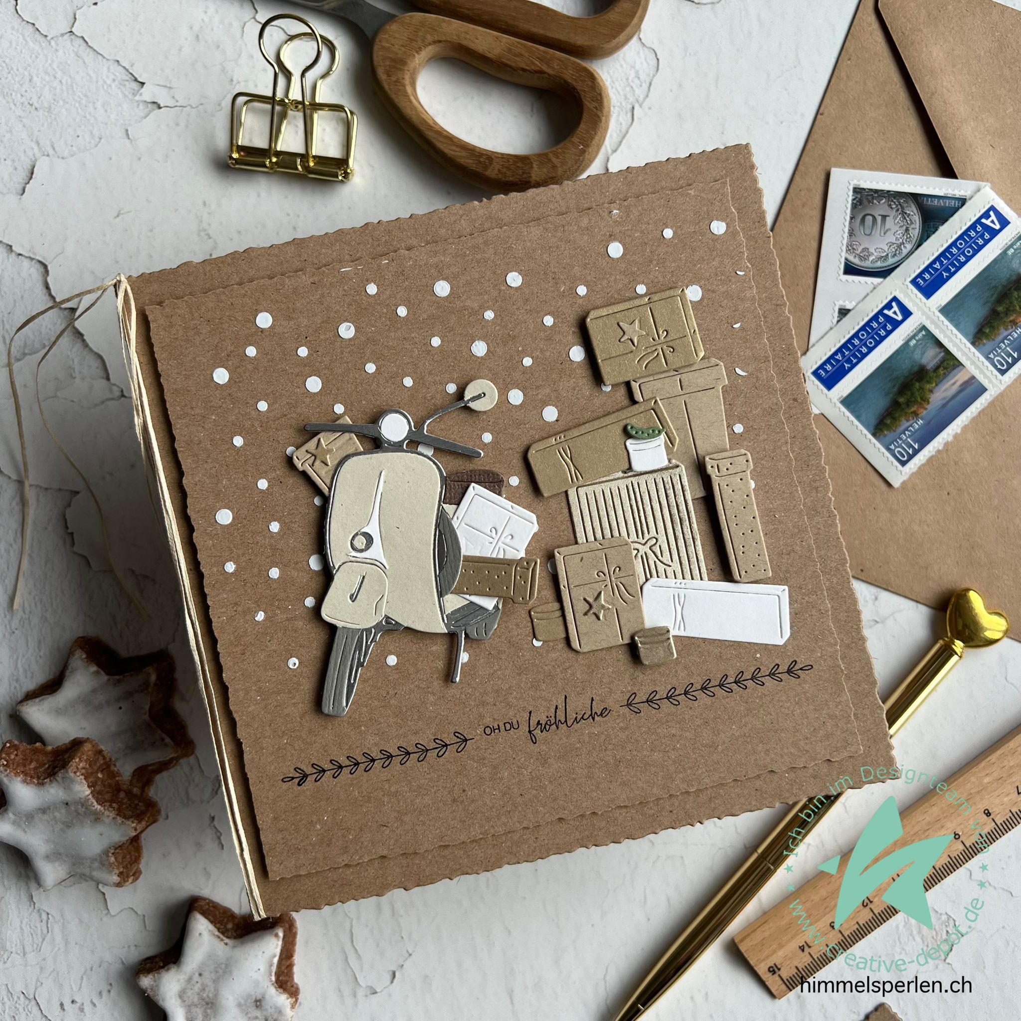 Ya sea como centro de una tarjeta o como elemento decorativo en un álbum de recortes, la "Vespa con regalos" atraerá todas las miradas.