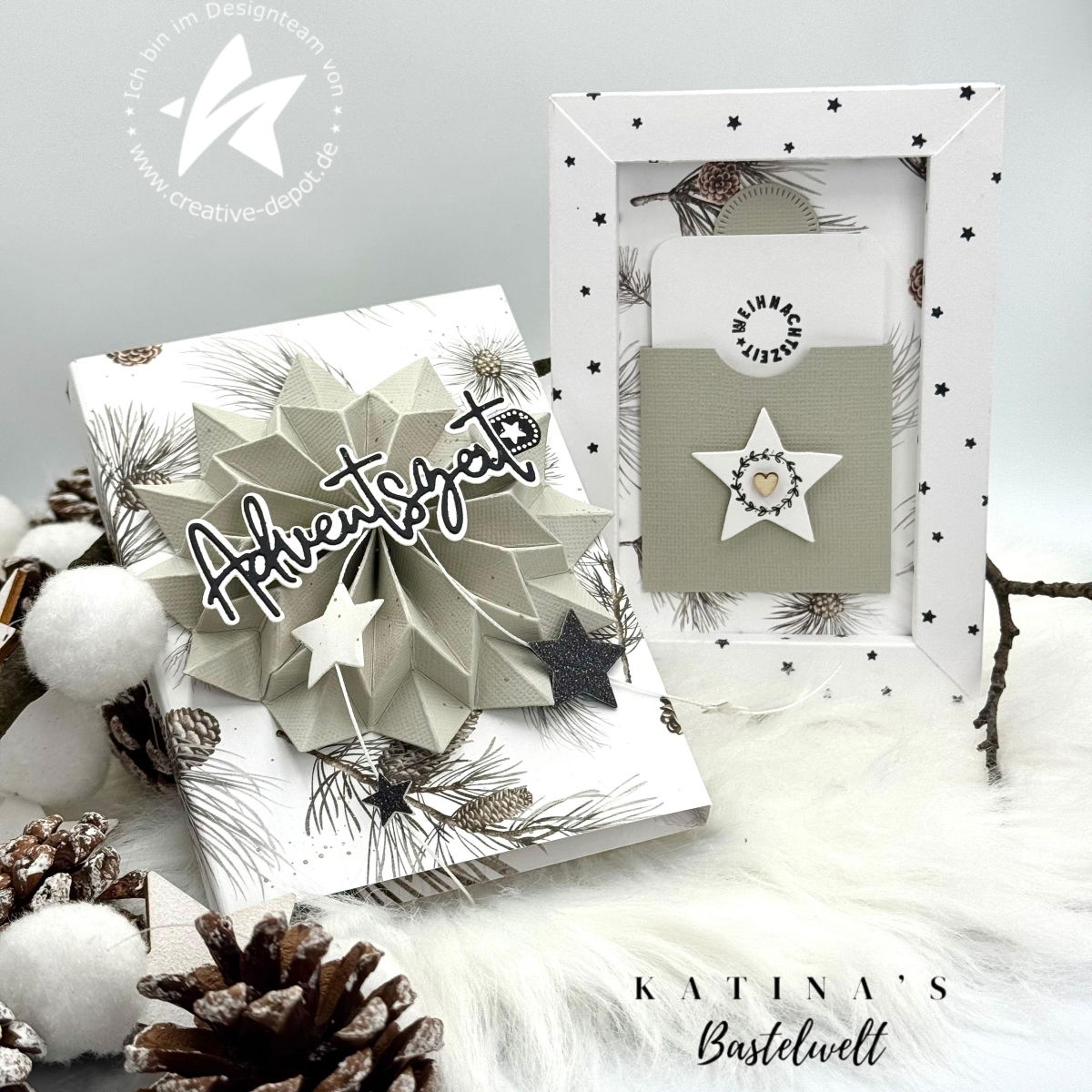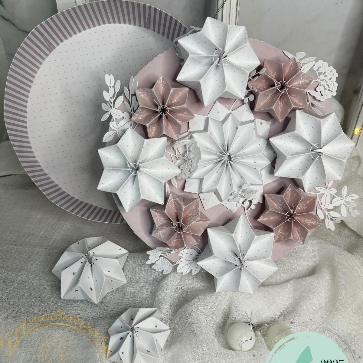 La estrella se troquela dos veces ✂️, luego se pliega en las líneas de plegado 📐 y se une en el centro con un hilo fino 🧵, y brilla en todo su esplendor.
