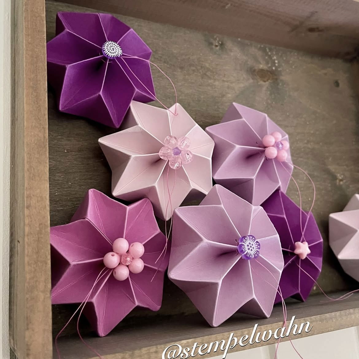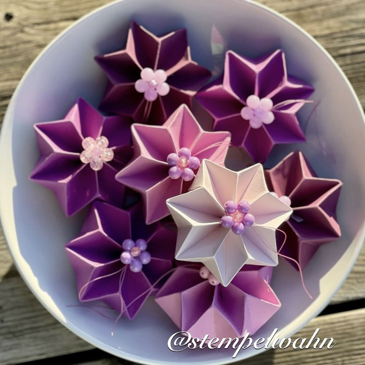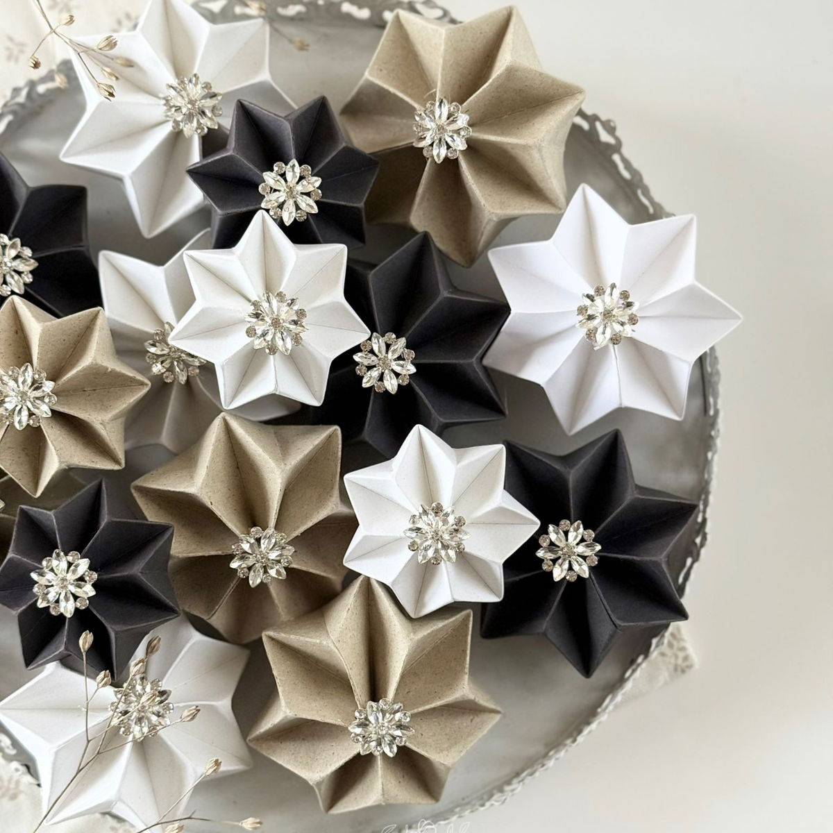 Las estrellas están simplemente arrugadas en las líneas de pliegue 📐 y unidas en el centro con un fino hilo 🧵 - creando un delicado realce.