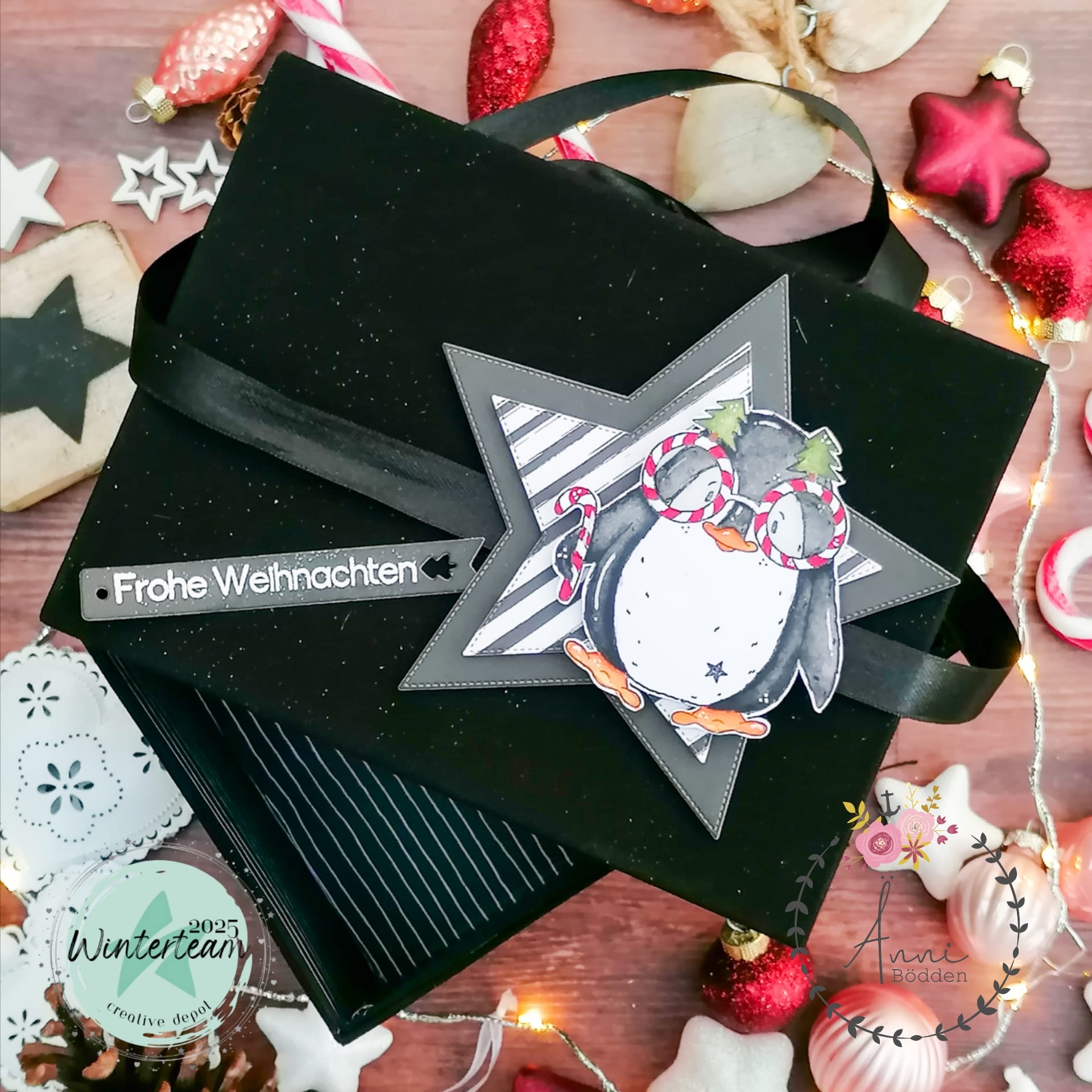 tu propia escena invernal con los pingüinitos: témpanos de hielo, regalos y copos de nieve crean un alegre mundo navideño que calienta todos los corazones.