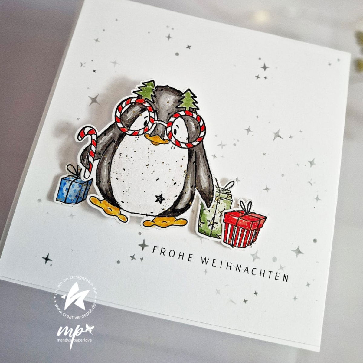 Cuatro pingüinos cariñosamente ilustrados en un ambiente navideño -a veces con luces de hadas, a veces con un bastón de caramelo o un regalo- garantizan diversión, creatividad y mucha alegría festiva en tarjetas, etiquetas y envoltorios.