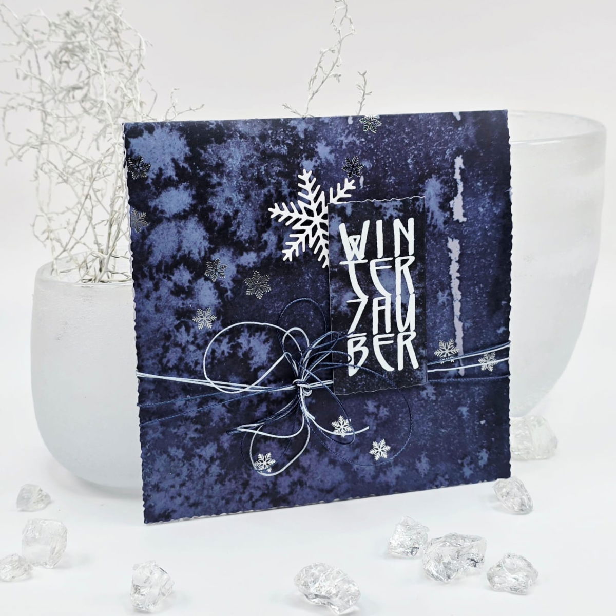 "tiene un tamaño de 30,5 x 30,5 cm, un grosor de papel de 300 g/m² y un acabado mate con copos de nieve plateados brillantes.
