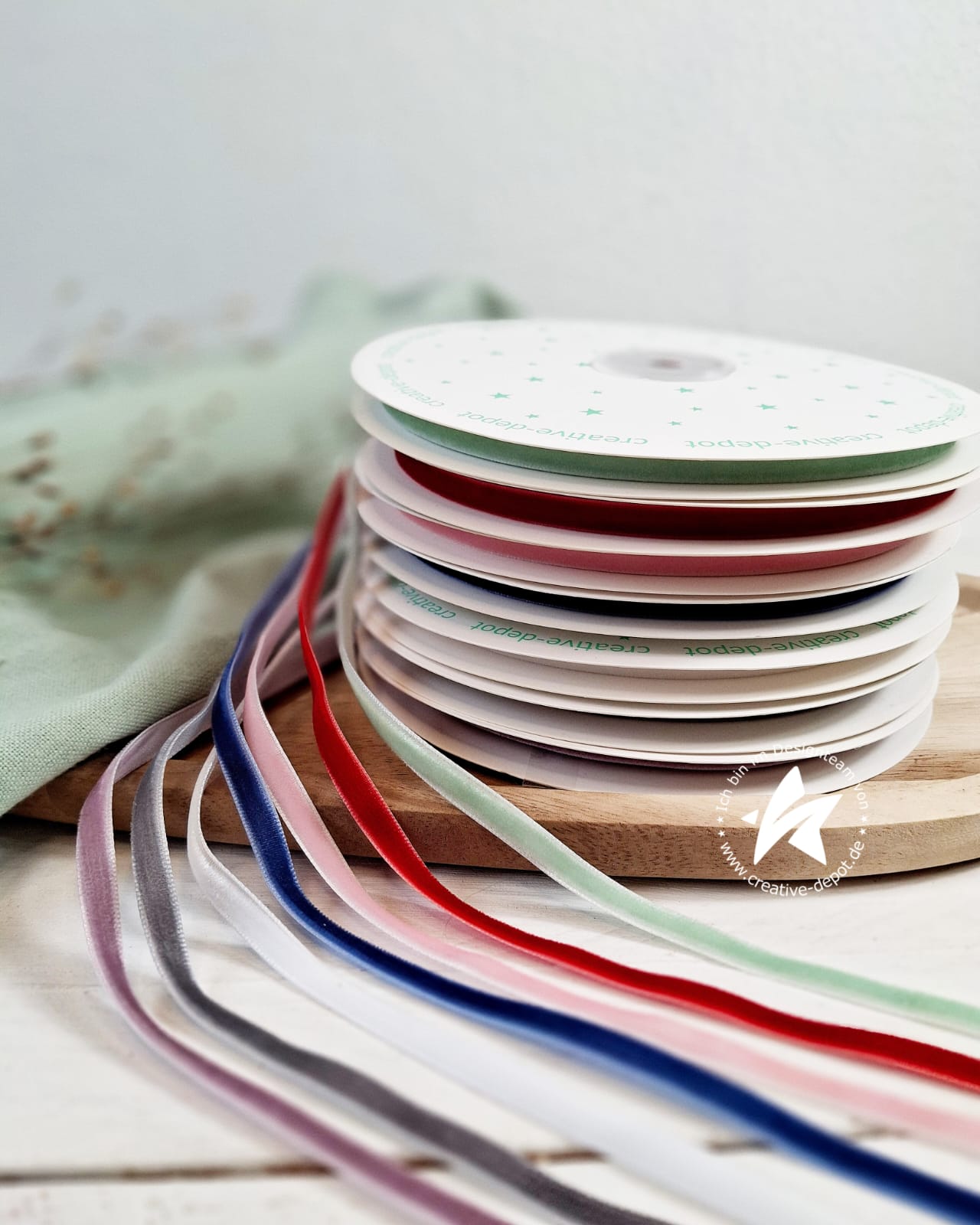 La cinta de terciopelo mide aprox. 0,7 cm de ancho y aprox. 10 m de largo.