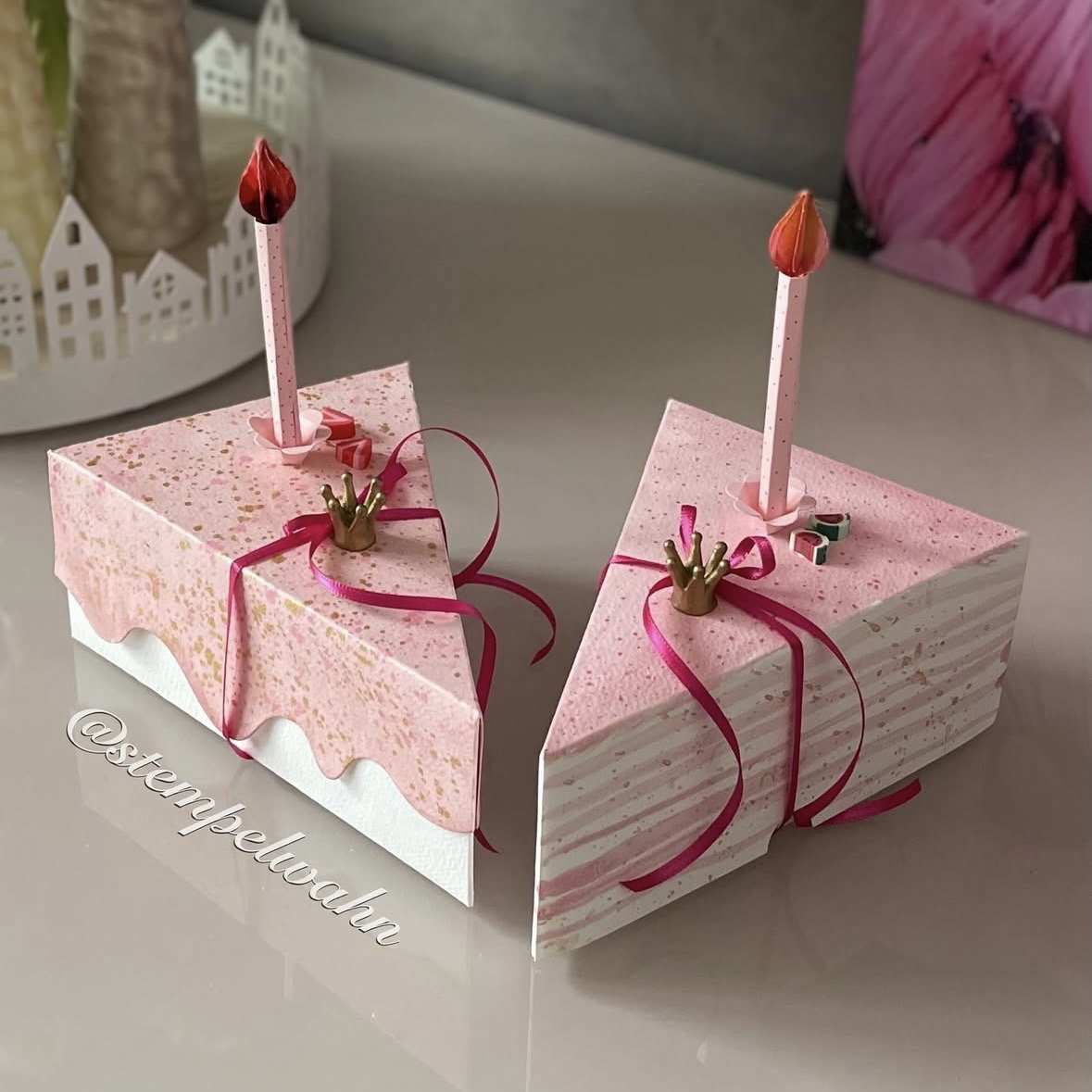 Un detalle especial: varias cajas juntas forman una «tarta de papel» completa, perfecta como regalo creativo o como centro de mesa decorativo en una fiesta de cumpleaños. 🎂✨