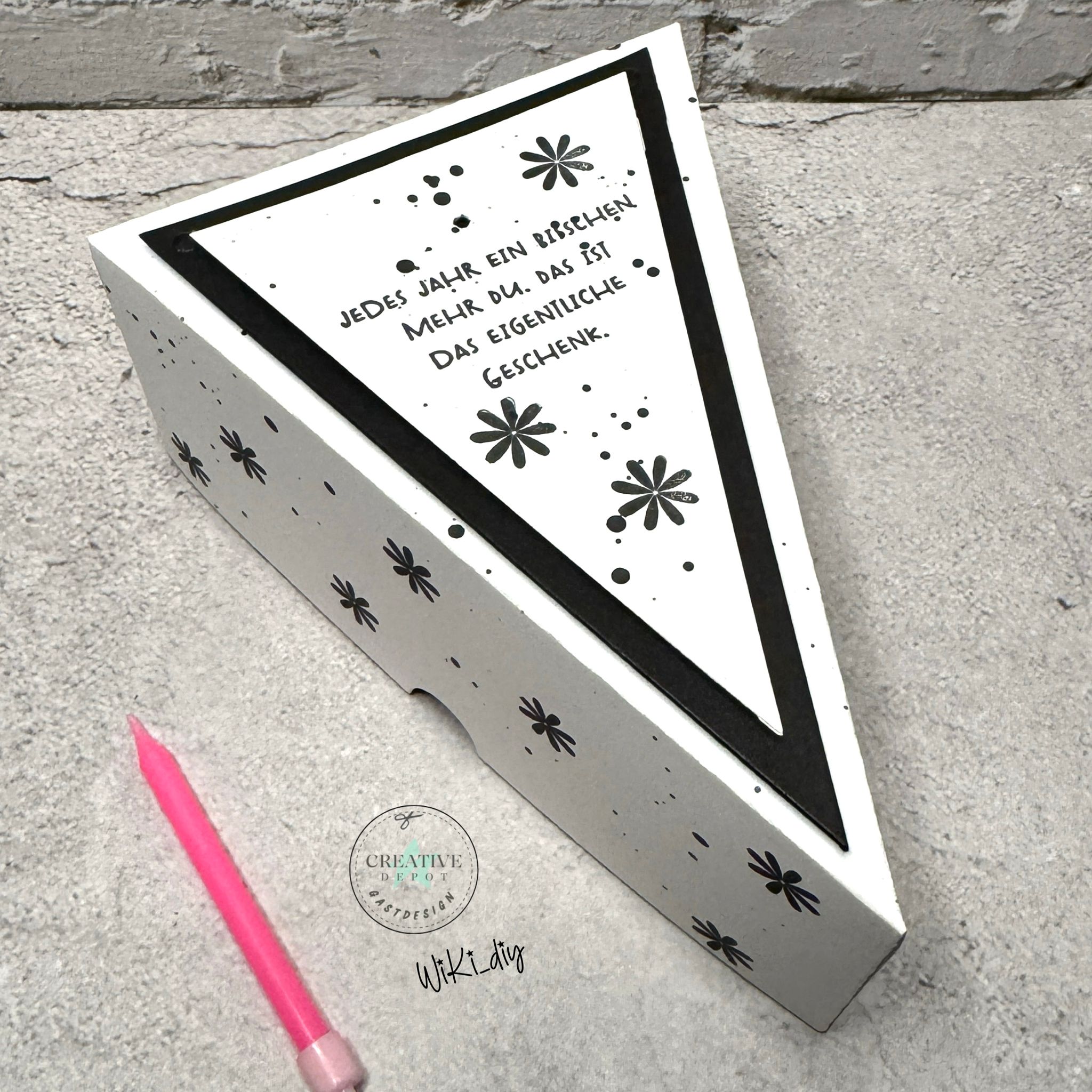 El troquel crea una práctica caja de regalo triangular, ideal para pequeñas sorpresas, dulces, vales o mensajes cariñosos. Gracias a las líneas de plegado precisas, la caja se monta rápida y fácilmente. ✂️📦