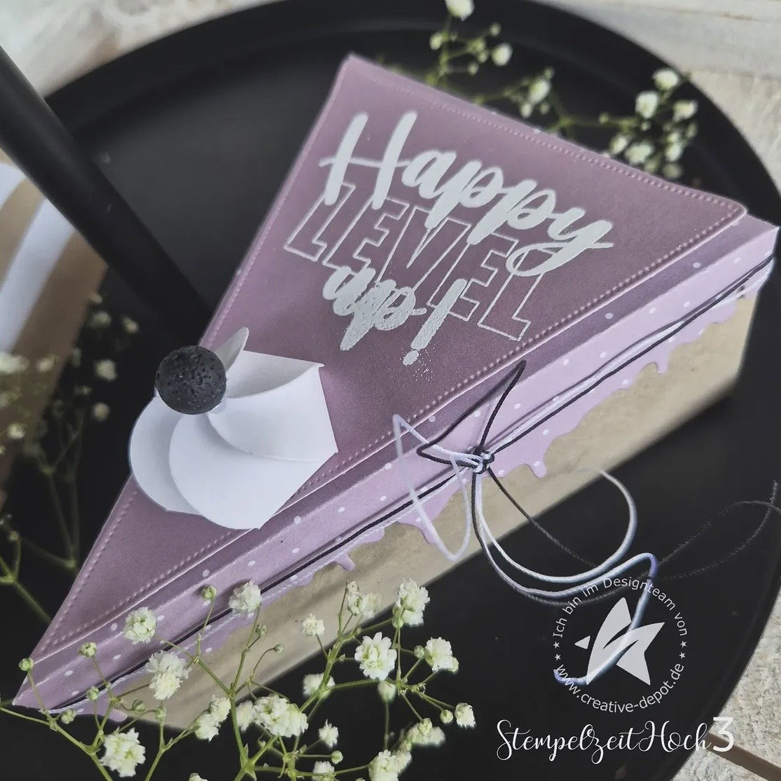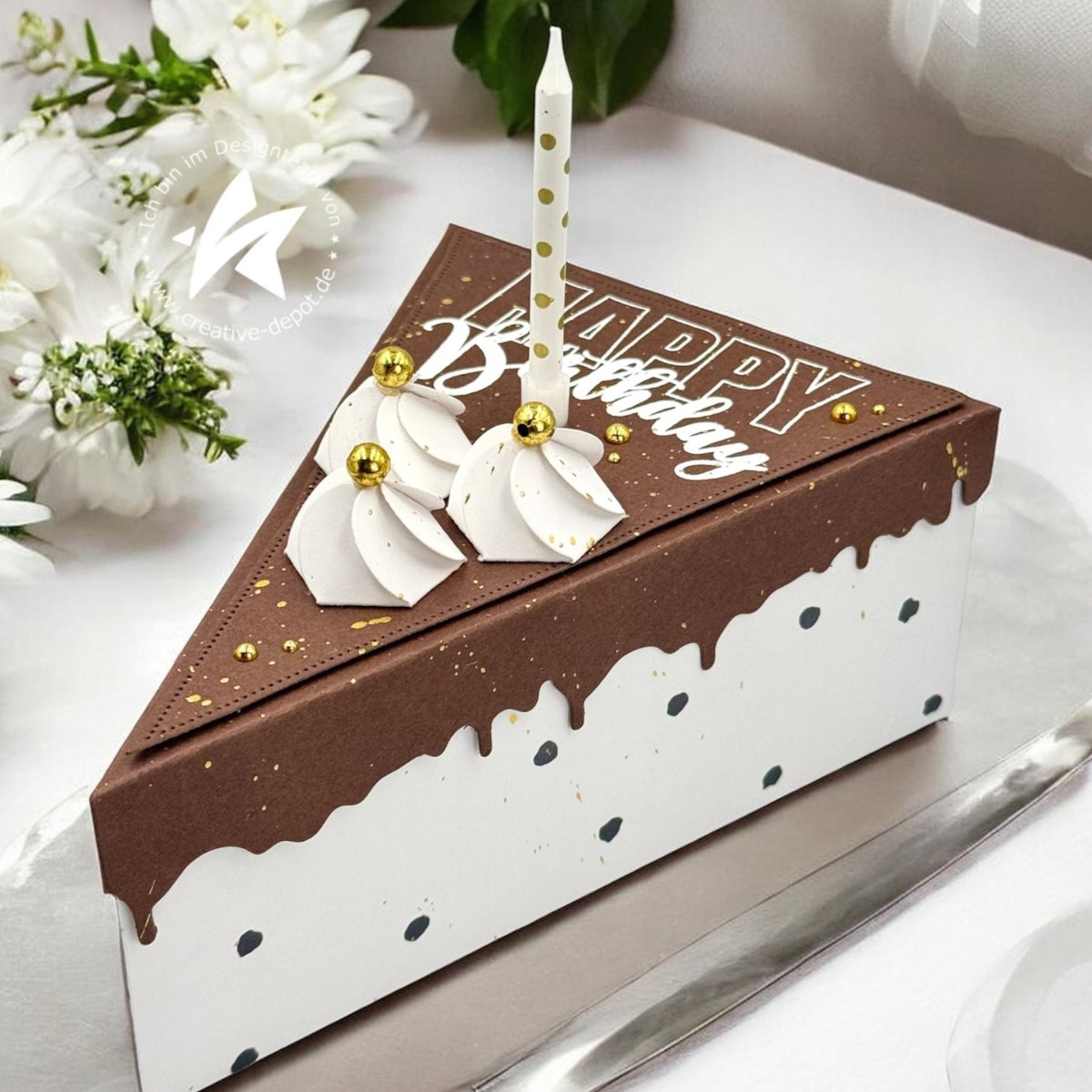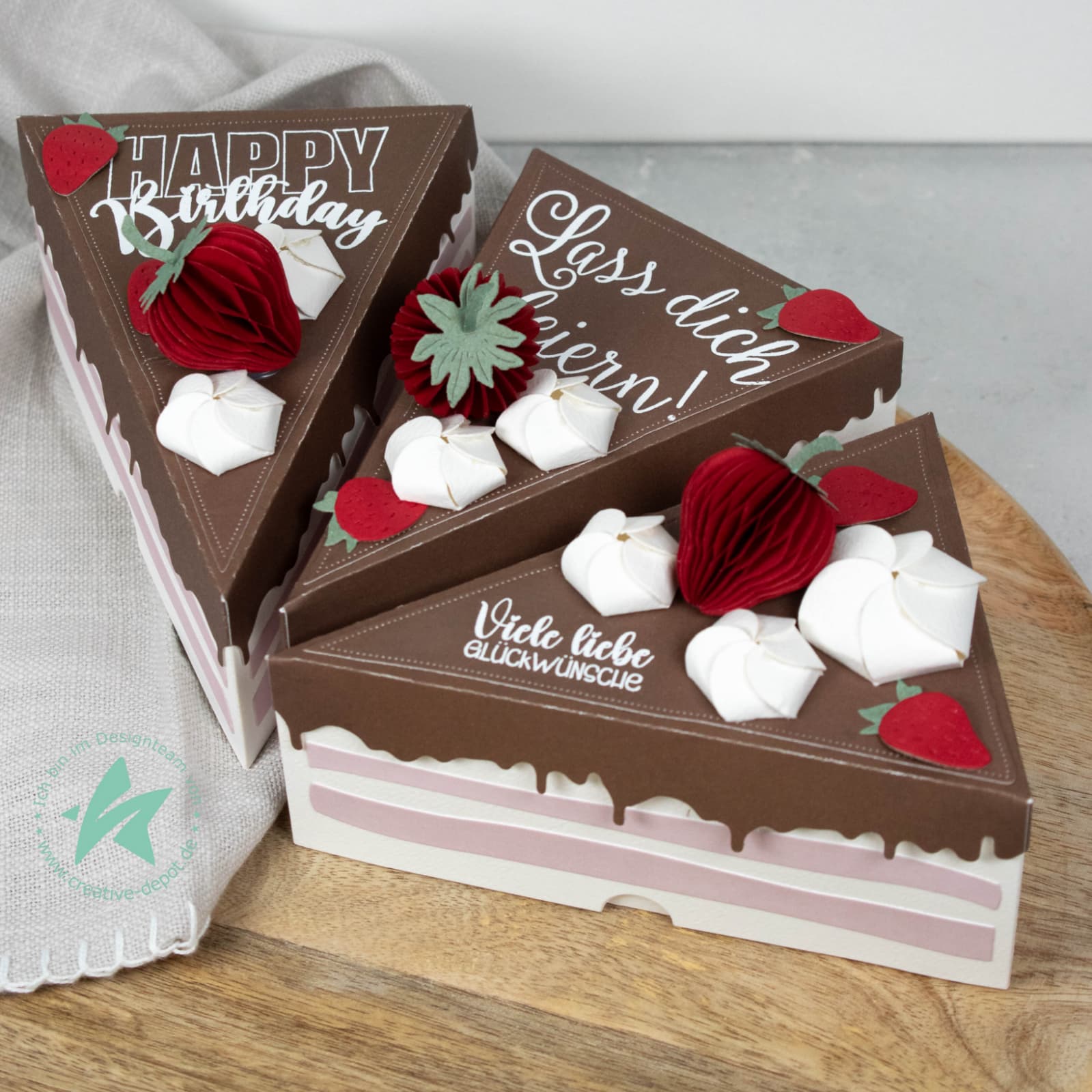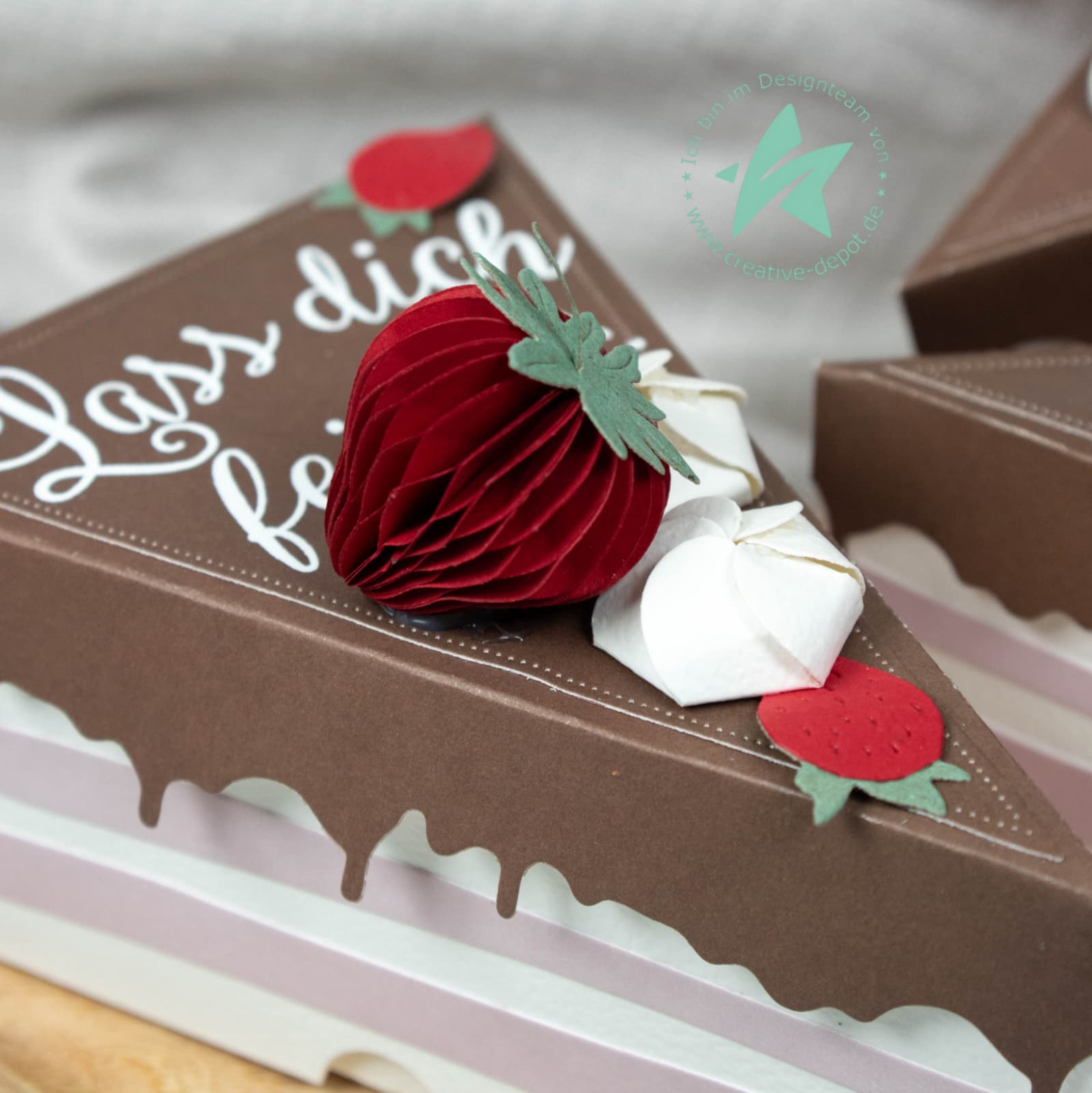 El complemento se ha diseñado especialmente para la caja triangular «Porción de tarta» y la completa a la perfección con un borde decorativo de nata y un elemento de cobertura a juego para la parte superior. Así se crea en un abrir y cerrar de ojos una minitarta de papel diseñada con mucho cariño. 🎂