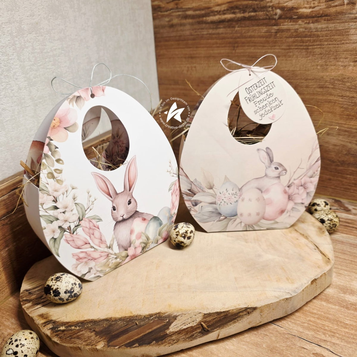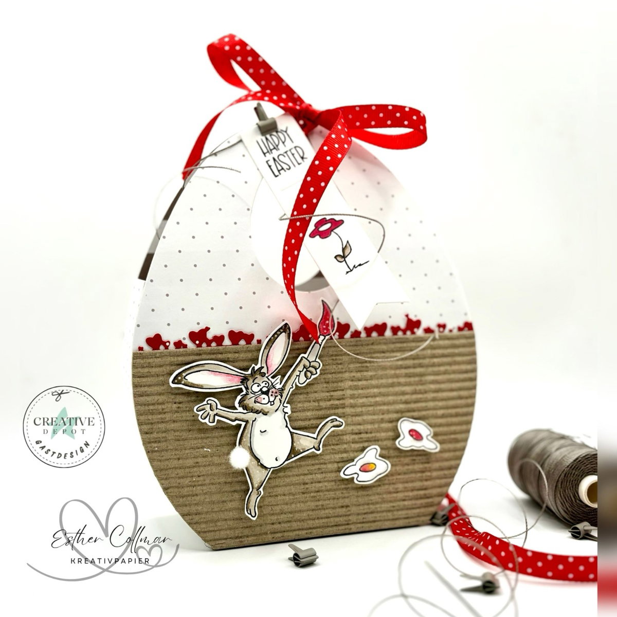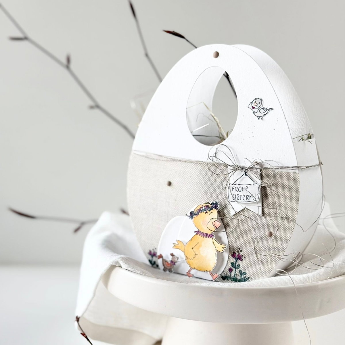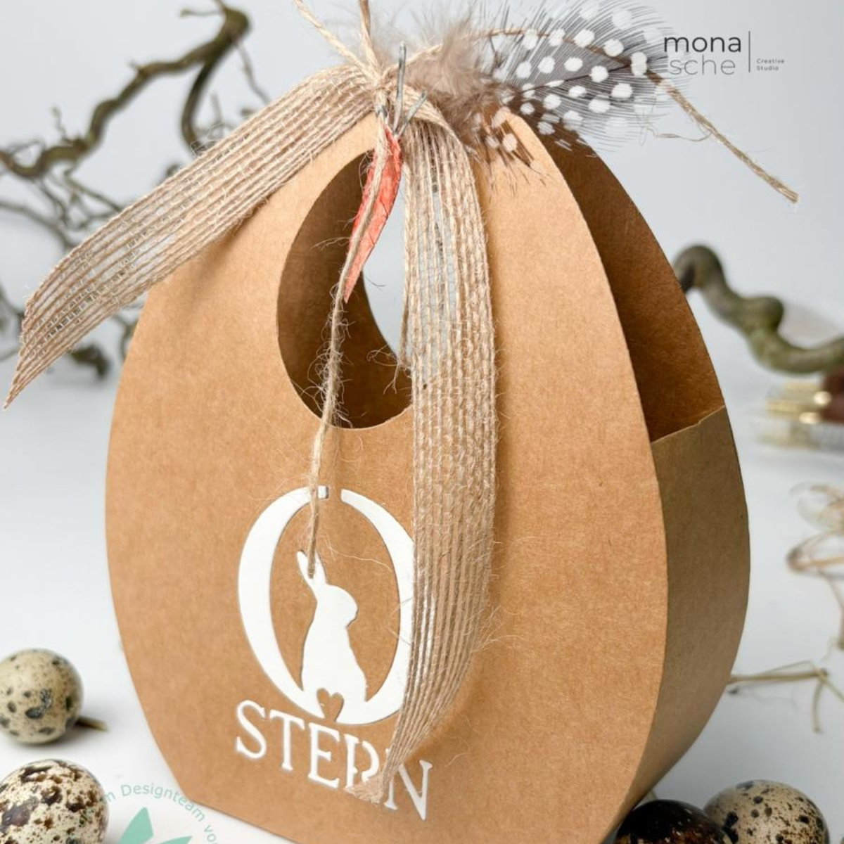 El set contiene todos los elementos para una bolsa de huevos resistente y decorativa, incluido un asa con orificio para colgar 🪢🔘, ideal para llevar, regalar o colgar en el árbol de Pascua 🌿🥚. Gracias a su sofisticada forma, la bolsa puede pegarse fácilmente 🖇️ y decorarse individualmente ✂️🎀.