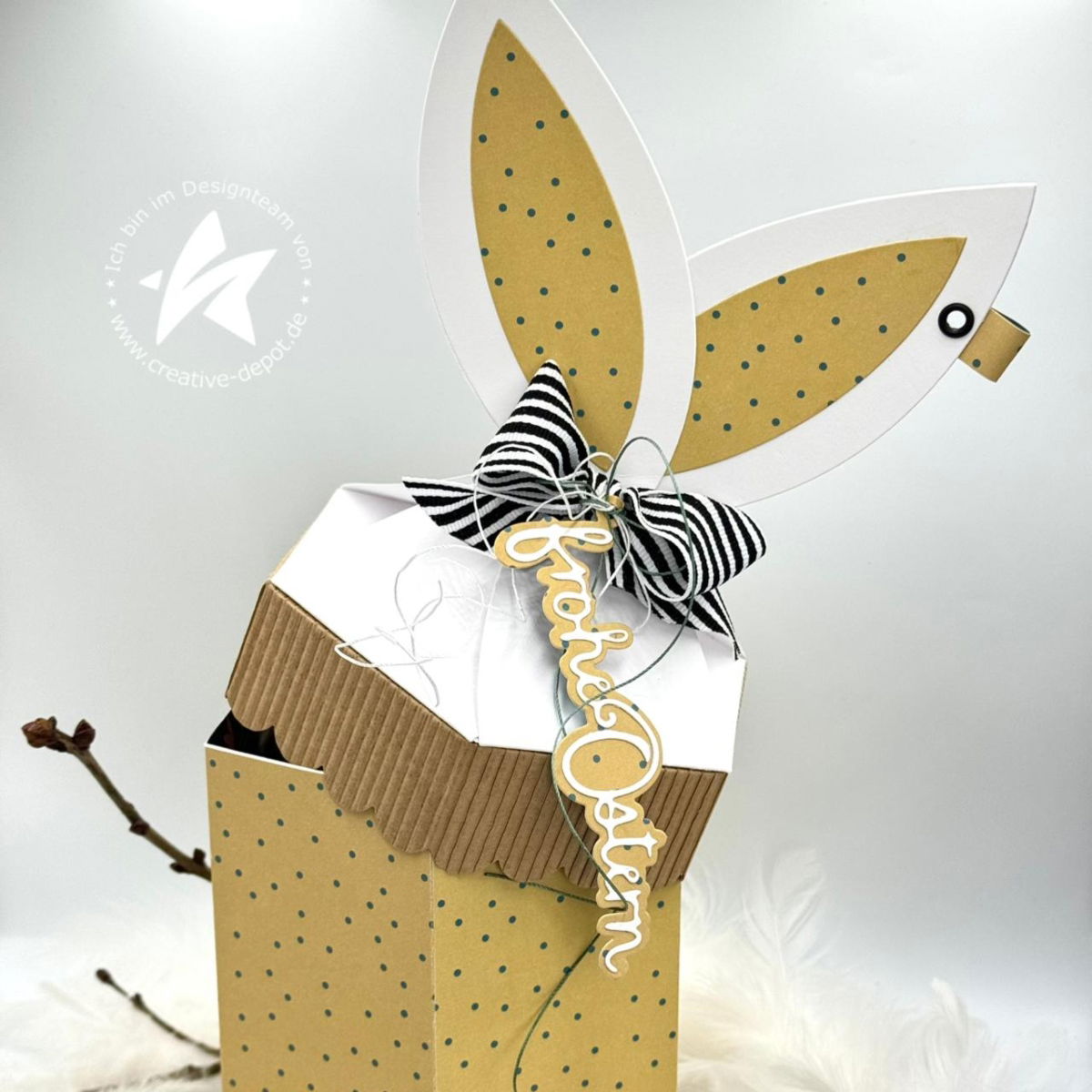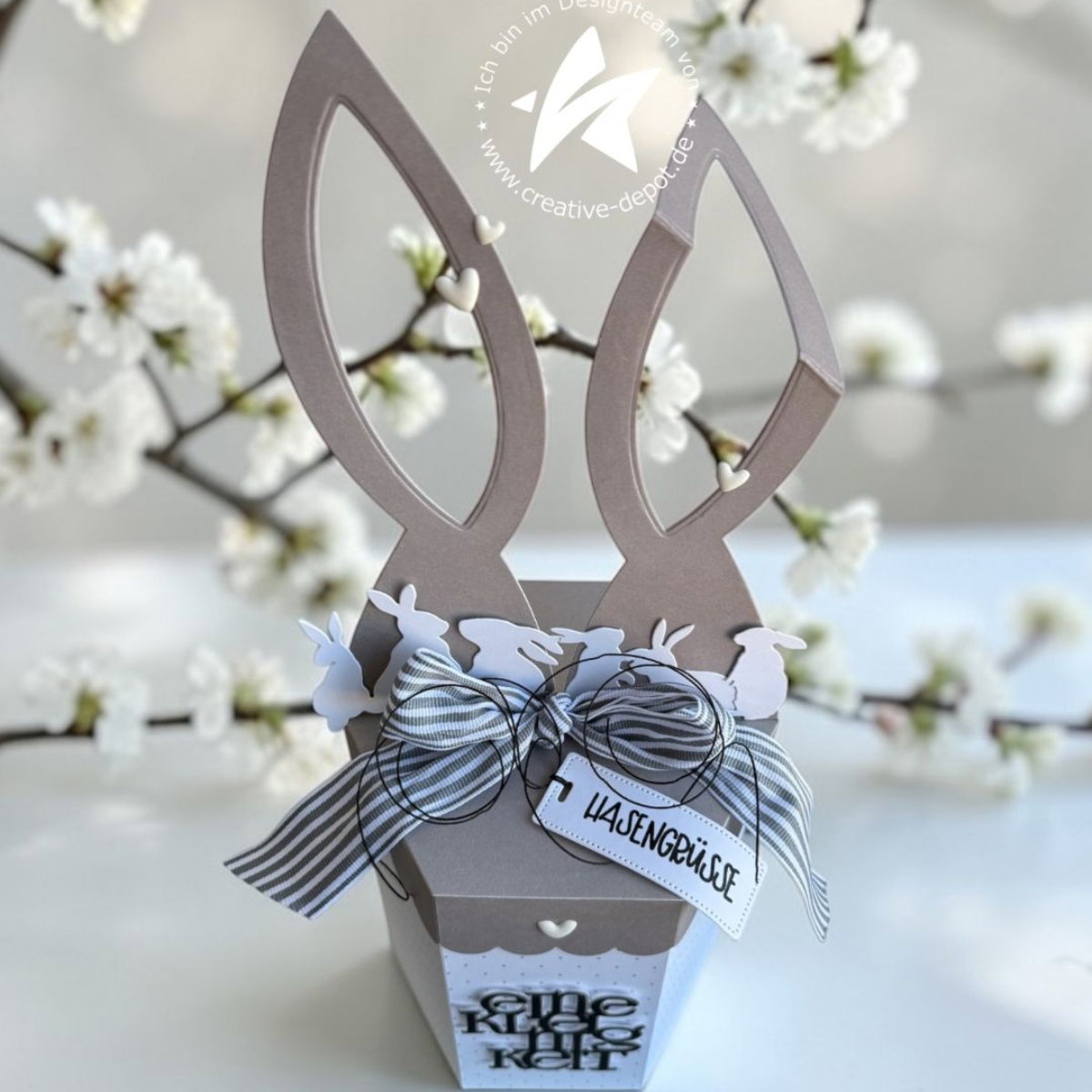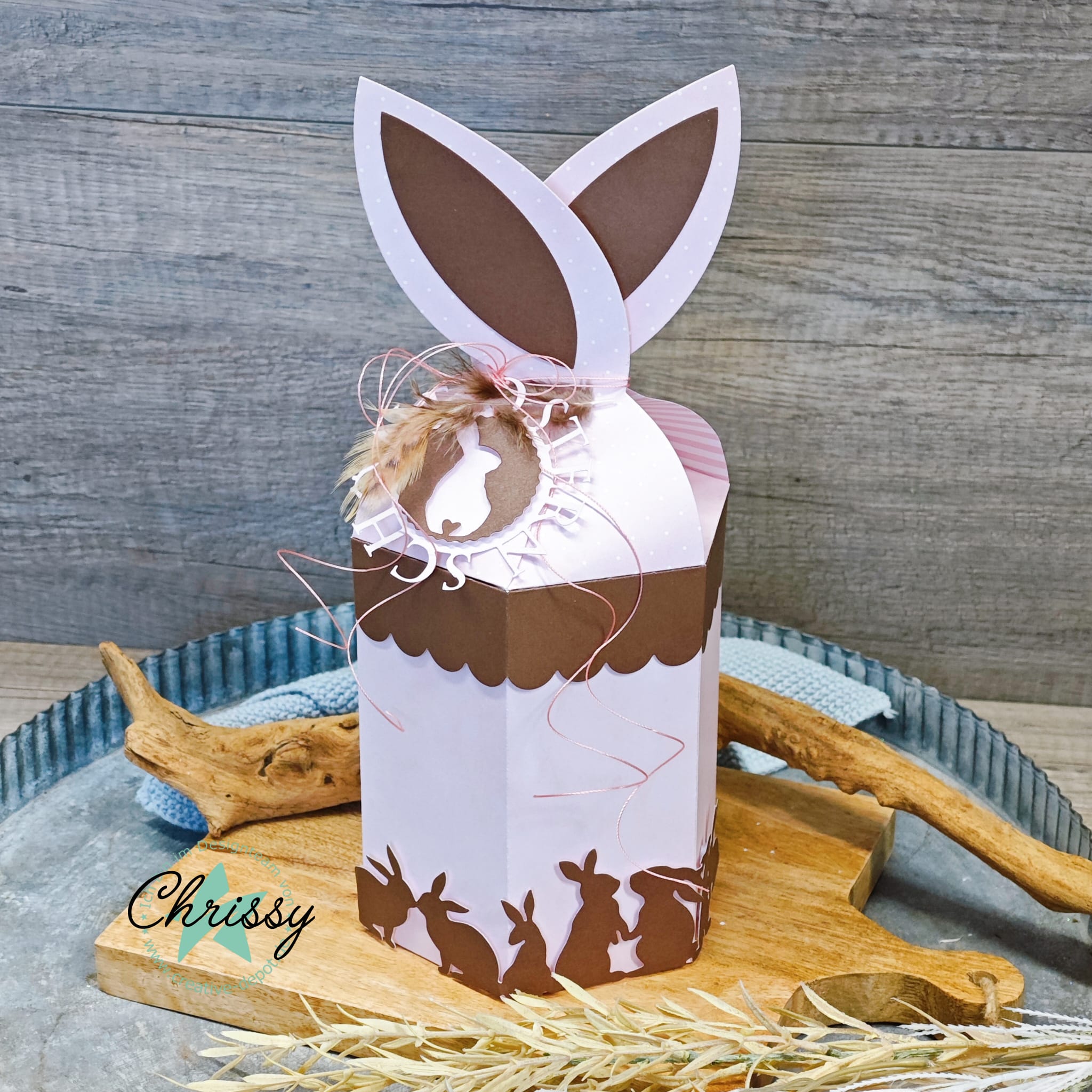 La moderna caja hexagonal se convierte en un simpático conejito de Pascua gracias a las grandes orejas de conejo: perfecta para rellenar, regalar y decorar 🌷✨