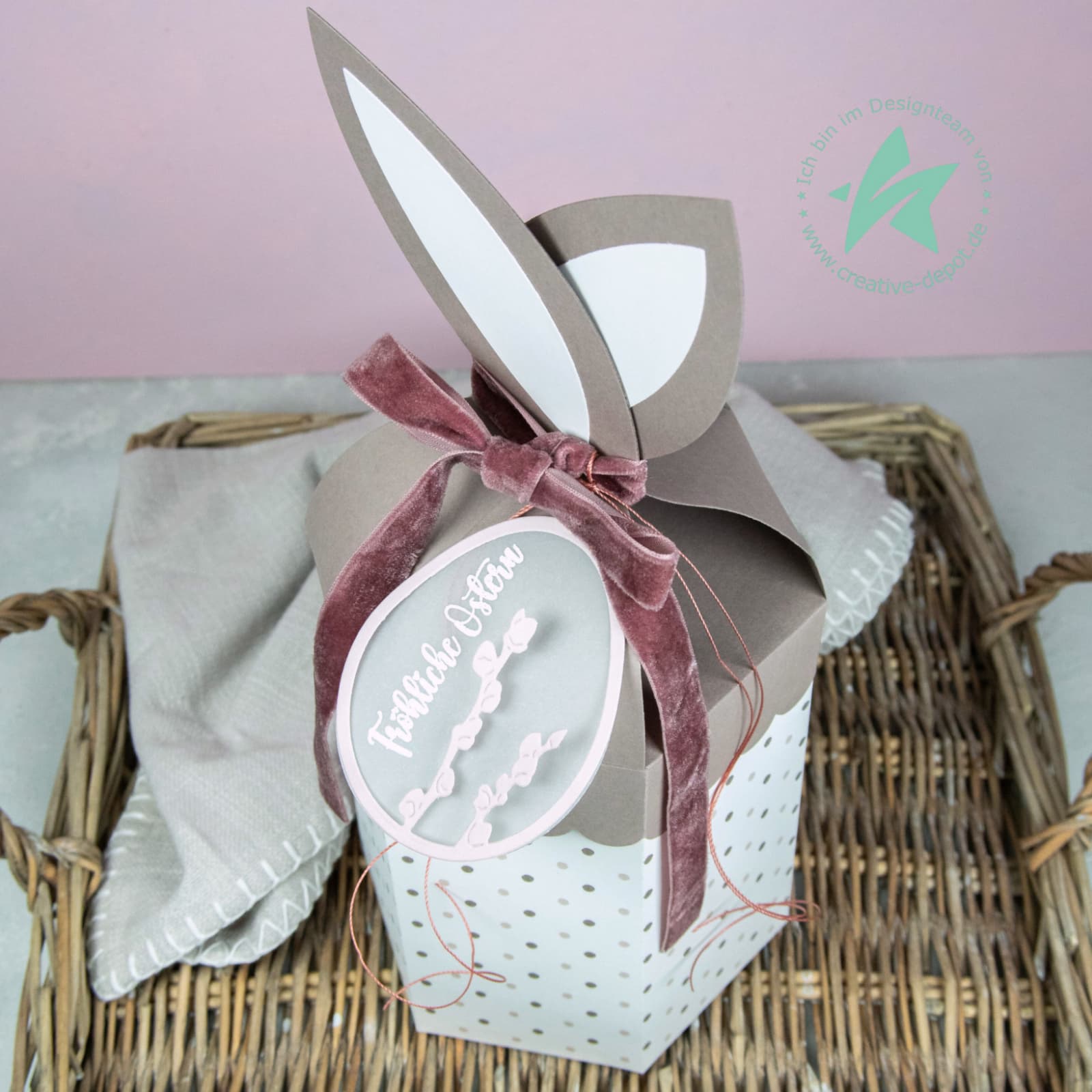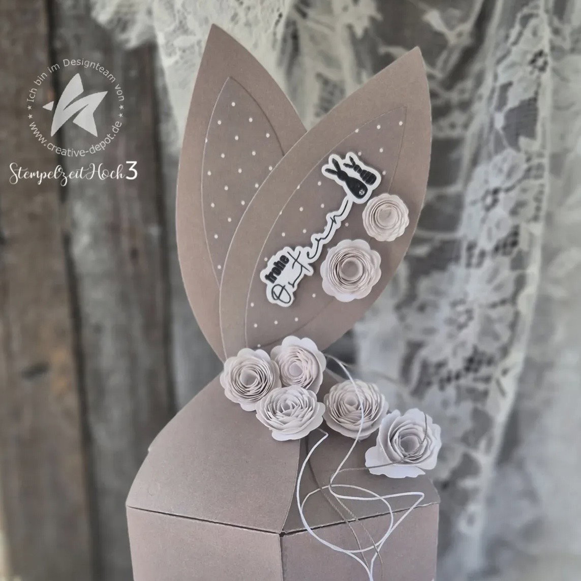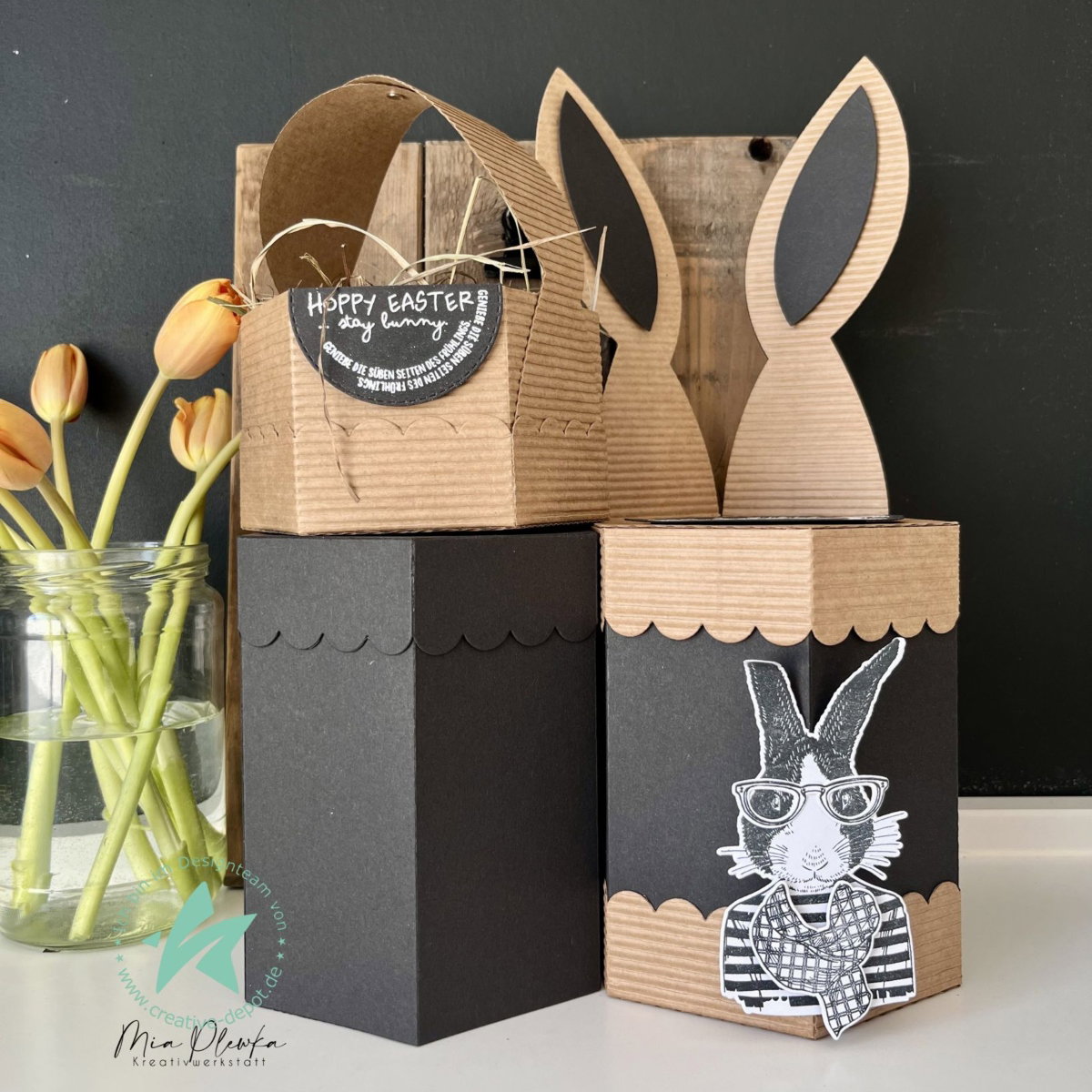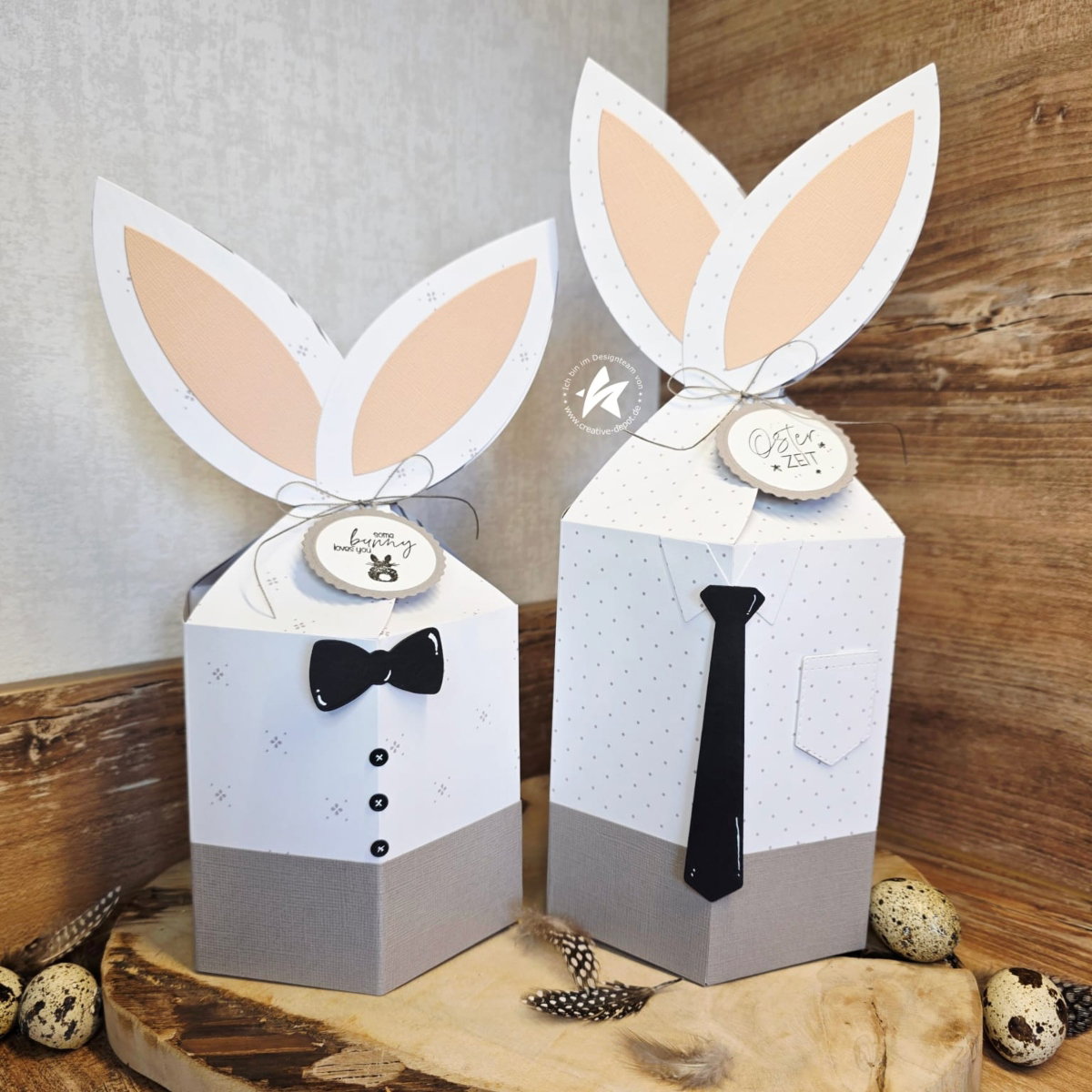 La moderna caja hexagonal se convierte en un simpático conejito de Pascua gracias a las grandes orejas de conejo: perfecta para rellenar, regalar y decorar 🌷✨